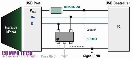 便攜式醫療設備的USB埠可能被用作為內置電池組充電的電源,還可以用以與照顧者之間的數據交換。 該端口可以成為靜電放電以及過載電流的入口通道。 如圖4所示為可以提供一套完整電路保護解決方案的技術組合。 首先,為了防範過電流條件,使用了一個自復式PTC元件。在這種情況下,選擇了具有非常低電阻且節省空間(0805封裝)的元件。 這個特性會確保在為設備充電時將浪費的功率損耗和電壓降被減至最低。 其次,可保護電源端口和I/0線路免受靜電放電。 圖4顯示了保護所有三組線路的一個陣列,且具有足夠低的電容值,以確保在高速(480Mbps)數據傳輸時不會丟失數據。