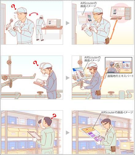 在業務用途方面,比如說在倉庫內收集貨物作業之際,在HMD的表示部分反應出做為嚮導,將目標產品可以俐落地完成作業。透過了HMD上所搭載的像機,可以將作業現場的樣子傳送給遠端的老鳥,透過HMD的畫面很快可以得到作業建議。
