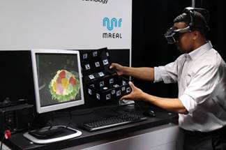 MREAL系統利用HMD上所搭載的像機將現實世界所取得的映像,有如3D CAD資料的三次元CG實際尺寸重疊來顯示。當使用者移動的時候,也會跟著改變視點,CG的看法當然隨之起變化。如此一來,設計的東西就如眼前所見的感覺;無須打造實體模型(mockup),也可以來驗證設計,削減了檢證作業的工程或是實體模型的製造費用。
