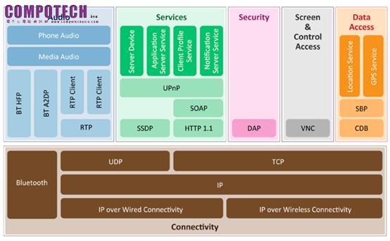 MirrorLink™標準結合了多種現有技術(圖 1)來滿足各種可能的車內使用情境,包括以虛擬網路運算(Virtual Network Computing,VNC)進行畫面顯示與用戶指令輸入、透過通用即插即用(Universal Plug and Play,UPnP)尋找對應的設備與完成正確的設定配置。目前MirrorLink™規格的核心是用PC遠端操控的軟體VNC,將VNC的客戶端軟體安裝於車用設備,將伺服器端軟體安裝於智慧型手持裝置,便可將智慧型手持裝置上的畫面傳送至車內車機螢幕。而根據MirrorLink™的規範,只要將智慧型手持裝置與車載資訊娛樂系統以USB連接,就能夠在車內直接進行互連溝通,MirrorLink™能運用即時傳輸協議執行聲音串流(Real Time Protocol,RTP),也能支援目前在車內經常使用的規格包括藍牙HFP與A2DP協議等技術。不過,能與車機設備串接的智慧型手持裝置及APP,僅限於經過CCC認證的產品。