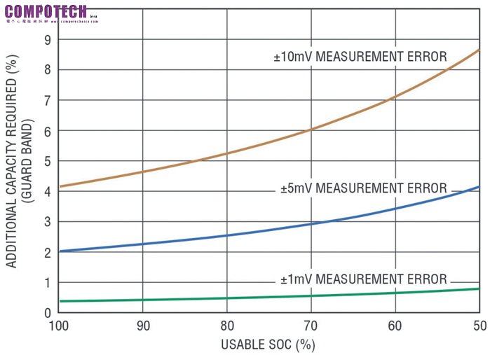可以擴展該論點以顯示針對各種不同電池測量誤差的“保護帶損失”及其與 SOC 範圍的相關性。如圖 3 所示,測量誤差僅為 1mV 的系統所需的額外電池容量不到 1%,甚至當電池組被限制在一個 25% 至 75% 的 SOC 範圍 (即 50% 的可用 SOC) 時也不例外。