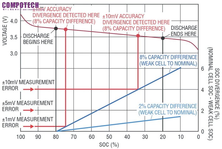 當考慮這個簡單例子以外的複雜狀況時,電池測量準確度的重要性就變得更加清楚了。例如:大多數電池組都存在連續的容量變化,並具有更加細微和難以檢測的 SOC 偏差。而且,電池在開始放電時不太可能都處於 80% SOC,因而或許會進一步掩蓋容量的變化。另外,應注意到 SOC 計算需要多個參數,這一點也是很重要的。這些其他參數的測量誤差並未減低對於準確電池電壓測量的要求。相反,犧牲電池測量準確度將很可能擴大電池壽命的分佈。