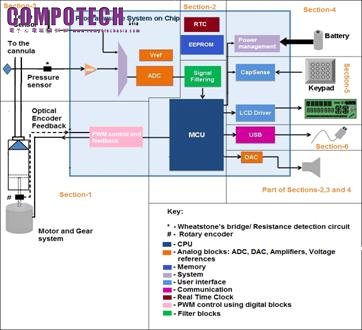 2. 由於胰島素幫浦為電池供電裝置,因此運作功耗與睡眠模式的電流是相當重要的考量因素。另外,由於傳統MCU需在更高的電壓範圍運作,而電池輸入的電壓卻低於MCU運作所需的電壓,因此還需要升壓程序。而在SoC中的高整合設計架構即能解決這些問題。
