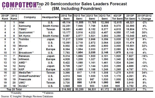 表1: IC Insights 2013年Top 20半導體銷售大廠預估