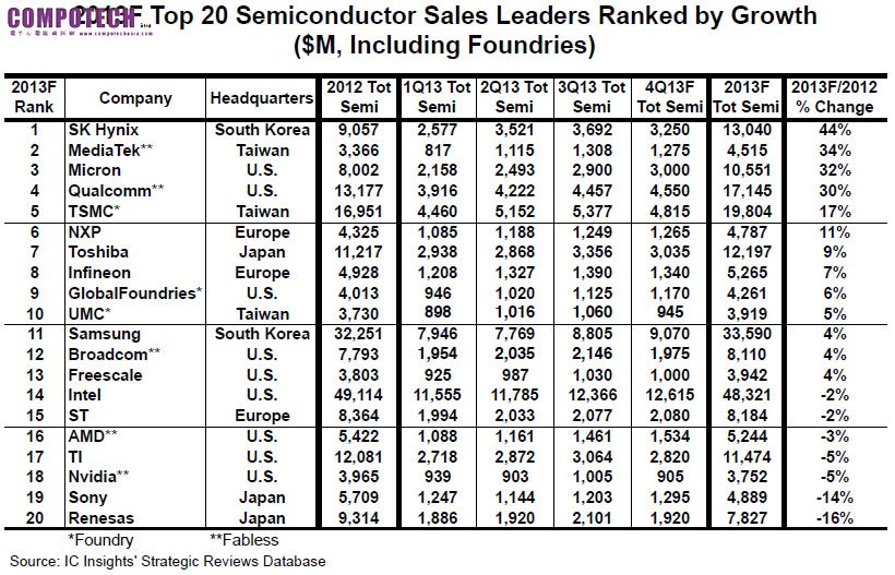 2013年11月IC Insights做出全球半導體業前20強業績排行,前四強英特爾,三星,台積電高通排名固定不動,但龍頭英特爾嚐到負成長的壓力,排名第4的高通以年成長率30%與第16名聯發科的34%雙雙反應享受到智慧型手機晶片業績亮眼的成果。另一方面,記憶體雙雄SK Hynix與Micron也都以44%及32%年成長率的佳績在排名上都躍升了幾級,即使SK Hynix在2013年遭逢大陸火燒廠之災也無損在記憶體市場的地位。日系半導體商除了Toshiba正成長穩住第6名外,Renesas瑞薩、Sony、Fujitsu富士通等三家大廠均兩位數負成長,其中跌出20大之外的富士通(2012年排名16)在2013年八月將其核心的MCU與類比元件部門賣給Spansion。看來,對其他20強廠商而言,2014年如何扭轉頹勢考驗著經營團隊哩!(編輯部)