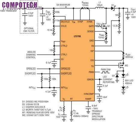 與很多大功率 LED 驅動器不同的是,LT3795 自己產生擴展頻譜斜坡訊號,以產生比所設定開關頻率低 30% 的開關頻率調變。這降低了其傳導的 EMI 峰值,減少了對昂貴和笨重的 EMI 輸入濾波電容和電感的需求。