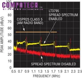汽車 LED 驅動器必須精小、高效率,且支援無閃爍 PWM 調光。這些驅動器不能在 AM 收音機頻段及該頻段周圍產生很大的傳導 EMI。不幸的是,大功率開關模式電源本質上不是低 EMI 的,固定開關頻率在一些頻點上會產生極大的 EMI ,包括電源的基本工作頻率及其諧波。這些不好的東西總會落入 AM 頻段。