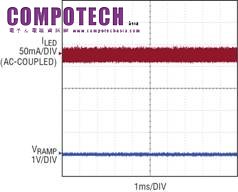 RAMP 接腳端的 6.8nF 電容將擴展頻譜頻率調變訊號設定為 1kHz 三角波,也就是說,LT3795 的工作頻率每毫秒在 300kHz 至 450kHz 頻率範圍內來回變化一次。增加 1kHz 三角波擴展頻譜訊號對 LED 紋波電流的影響可以忽略不計,如圖 4 所示。