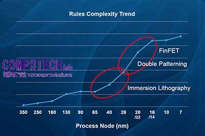 圖2:設計複雜度會隨著製程節點微縮趨於複雜,65 nm 以下製程難度更形陡峭