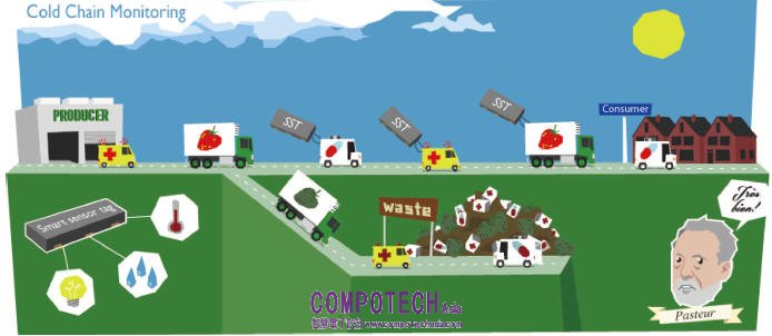 圖:冷鏈管理示意圖,物流供應鏈的監控和控制系統由多個感測器標籤、中介軟體、連網介面和雲端平台所組成