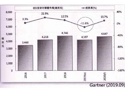 2019 年,記憶體市場的動力枯竭,儲顆粒價格下跌,智慧手機、PC 需求雙雙放緩,同時期中美,日韓的貿易爭端加劇,5G 進展未及預期等多種因素,讓市場的觀望情緒嚴重,各大機構對2019年全球半導體市場都做出了負成長的評估。