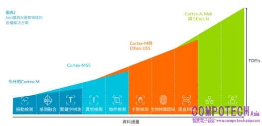 Arm Cortex-M55是第一個使用Arm Helium向量處理技術的處理器。與前一代的Cortex-M處理器相比,它的ML效能最多可以提升15倍,DSP效能提升五倍。針對各式各樣的物聯網使用案例。對於由電池驅動的物聯網裝置,這顆處理器整合了不同的AI技術,同時兼顧系統成本與耗電量方面的限制。