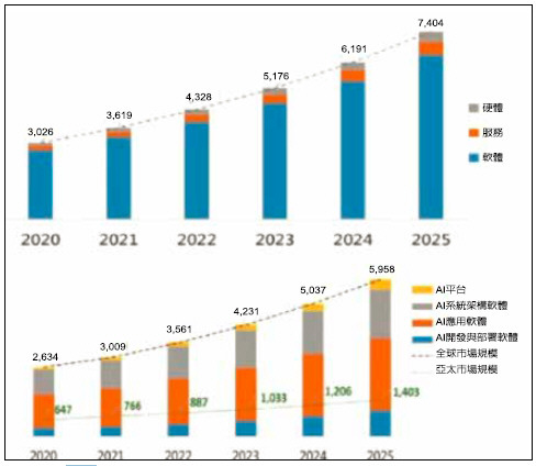2021 年全球AI 整體市場營收( 包換軟體、硬體、服務等) 超過3600 億美元,並將維持20%的高增長率,預計到2025 年突破7000 億美元。
