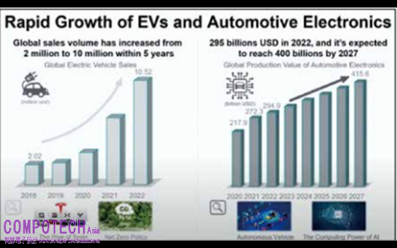 財團法人車輛研究測試中心 (ARTC)董事長王正健指出, 受到特斯拉(Tesla) 崛起與淨零政策激勵,過去五年 (2018 ~ 2022) 全球電動車銷量已從 200 萬成長至 1,000萬輛;日後在自駕車與 AI 運算領航下,預估 2027 年,汽車電子市值將從 2022 年的 2,950 億美元成長至 4,000 億美元。隨著集成越來越多的資通訊科技 (ICT),今 後 的 汽 車 不 只 是 交 通 工 具,更 是 智 慧 移 動 載 具, 持 續 圍 繞「CASE」——Connectivity ( 連接 )、Autonomous ( 無人駕駛 )、Shared ( 共享 )、Electrification ( 電氣化 ) 演進。對照台灣車電市場亦見蓬勃,2022 年車電產值達 120億美元,未來三年內可望跳增至210 億美元。
