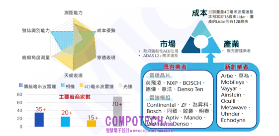 李 亦 晴 指 出, 現 今 光 達 (LiDAR) 感測器仍是先進駕駛輔助系統 (ADAS) 的主流,約佔七成市場;但 4D 毫米波雷達在既有距離、速度、角度的基礎上增加垂直俯仰角數據獲得更高的精度訊息,可補償傳統毫米波雷達的不足;再結合相機辨識功能,可望為自動駕駛的視覺感測提供高性價比解方而成市場新寵。