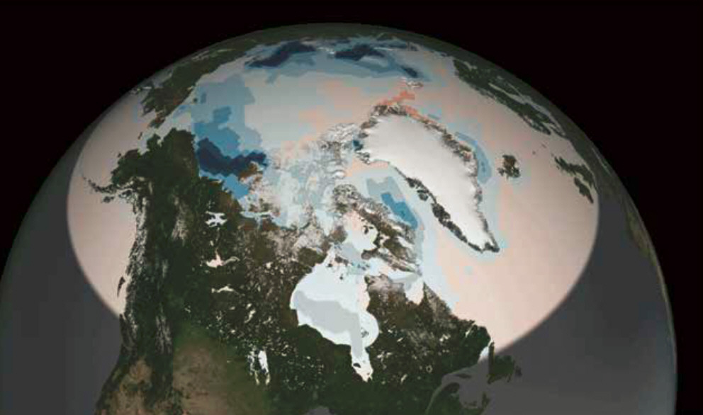 圖說︰ 2000 年至2014 年北極夏季月份海冰和太陽能吸收的變化。藍色表示海冰減少的地方,紅色表示太陽輻射吸收增加的地方。