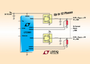 2012年2月8日–凌力爾特(Linear Technology )日前發表雙組輸出同步降壓DC / DC控制器LTC3861,其具備多相操作、差動輸出電壓感測和高頻率操作。此控制器可與外部的動力傳動裝置搭配操作,如Power Block(機械傳動裝置)和DrMOS,以及分立式 N通道 MOSFET與相關的閘極驅動器,因此可達到彈性化的設計配置。多達 12個相位可並聯且設定成反相時脈,以針對非常高電流之要求(達300A)將輸入和輸出濾波之要求降至最低。應用範圍包括高電流電源分配和工業系統、DSP和ASIC供應。