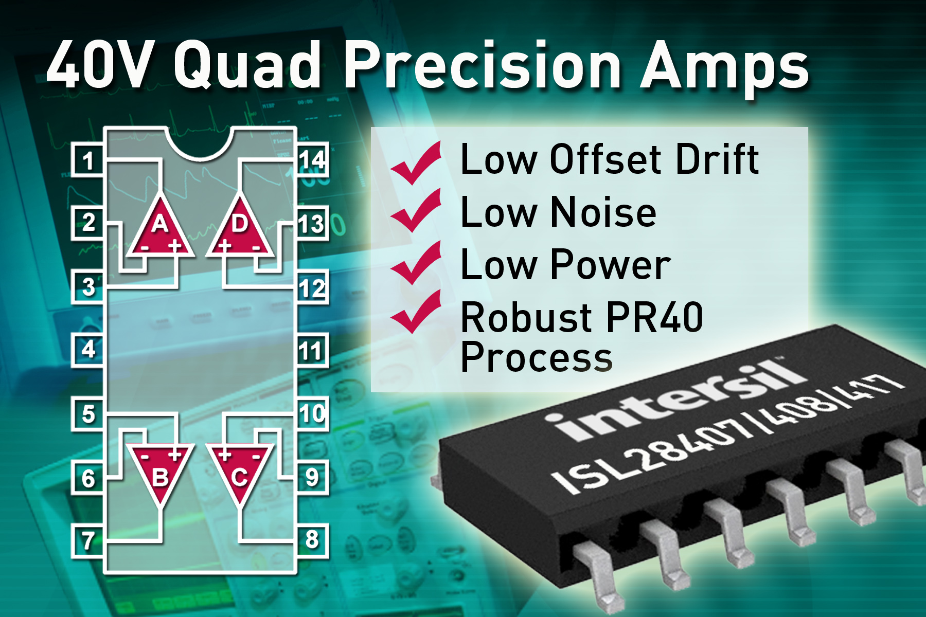 ISL28407、ISL28417和ISL28408採用Intersil的PR40先進Bipolar製程,以符合工控設計高增益前端的低雜訊需求,同時降低高速計數訊號應用時的整體功率消耗。