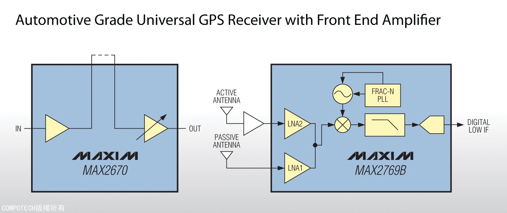 MAX2670為兩級低雜訊放大器,通常配置在天線模組或模組附近;MAX2769B則可配置在汽車儀錶盤內,作為衛星導航信號的接收器。MAX2769B具備業界最低的1.4dB雜訊係數,這項係數決定了接收器的整體靈敏度和快速鎖定衛星定位的能力。MAX2670採用通用設計,可以在兩級放大器之間加入外部濾波電路,為系統優化提供最佳的靈活度,此外,高整合設計還省去了昂貴的大體積分立式電晶體。這兩款元件搭配運作,能夠提供靈活的高性能、高可靠性導航系統方案。