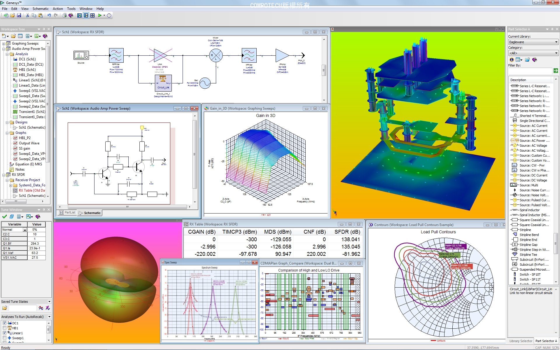 Genesys 2012提供業界最齊全的電路合成應用程式,可處理各種困難的設計,例如客製化的帶拒濾波器和寬頻匹配網路。該軟體藉由在被動模型中加入被動強制,來加強電路模擬器的準確度與聚合。現在Monte Carlo統計分析的結果還可被匯出到試算表,以執行進一步的分析與製作報告。