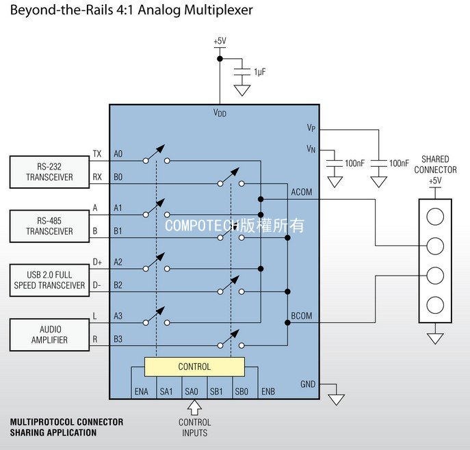2012年3月22日Maxim Integrated Products (NASDAQ:MXIM)推出±25V以上和以下擺幅類比多工器(MAX14778)和類比開關(MAX14759–MAX14764),能夠讓您切換/多工較寬的信號範圍從標準3V至5.5V供應。設計人員無需多個開關/多工器即可切換高壓和低壓信號。Maxim的超擺幅技術有效降低了電源需求並簡化系統設計。靈活、可靠的多工器/開關是通用系統信號切換及工業類比前端的理想選擇,典型應用包括:POS連接器、工業類比輸入、掌上型儀錶、ATE和音訊/資料切換。