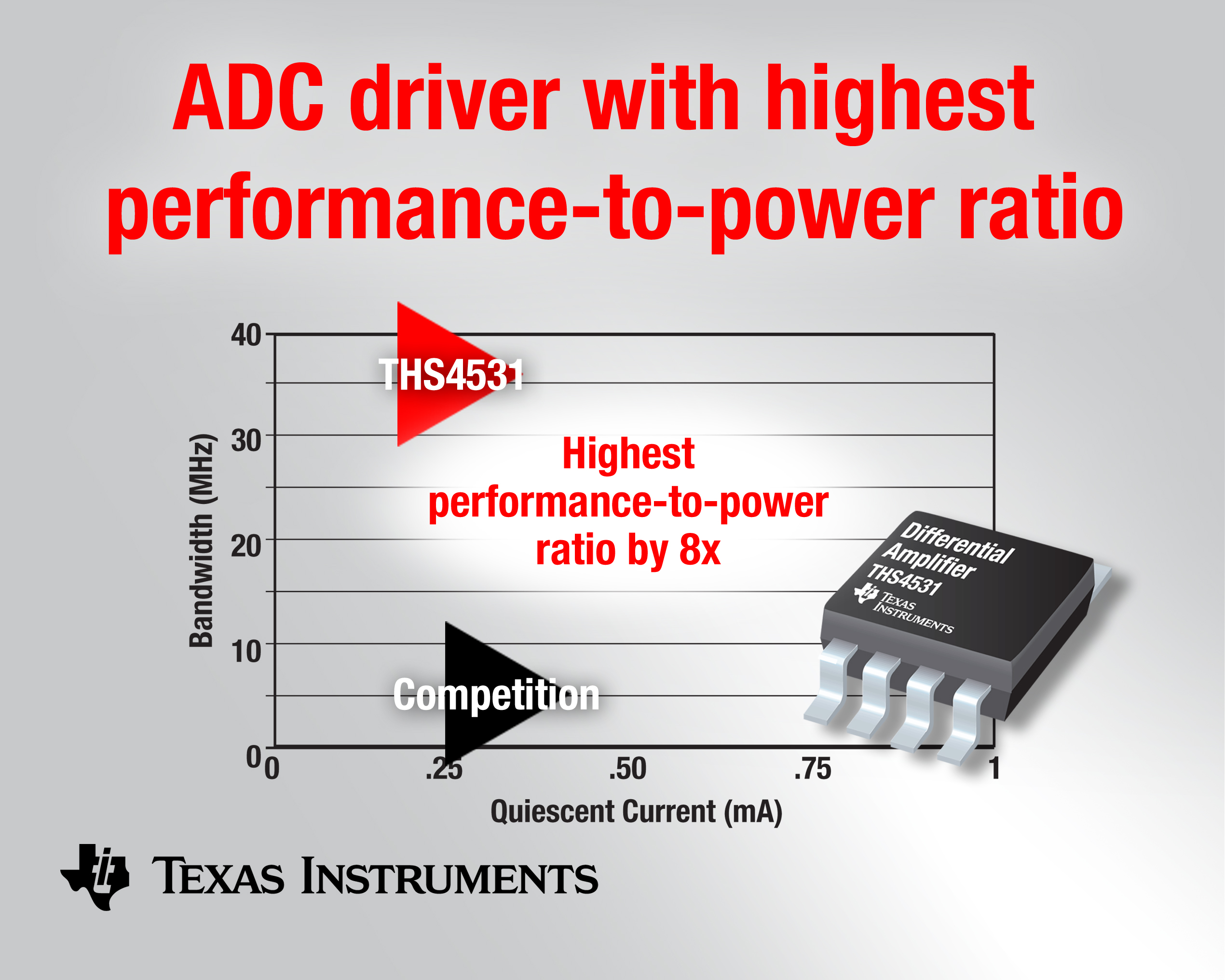 2012年4月2日--德州儀器(TI)宣佈推出全差動類比數位轉換器(ADC)驅動器,功耗效能比同類元件提高 8 倍,重新定義低功耗放大器市場。該 THS4531 全差動放大器靜態電流僅250 uA,頻寬達 36 MHz,可充分滿足流量計(flow meter) 與可攜式醫療裝置等可攜式高密度(high density) 系統的高效能與超低功耗需求。