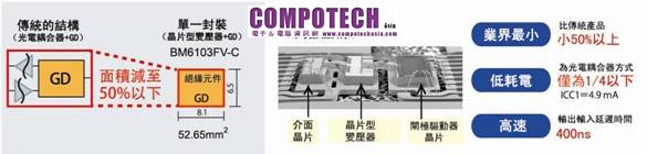 1. ROHM運用獨創的無線圈變壓器(Coreless transformer)技術,並內建2,500Vrms絕緣元件