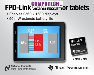 2012 年 5 月 17 日--德州儀器 (TI) 宣佈推出一款低功耗 FPD-Link 序列器 (serializer),為平板電腦、電子書、筆記型電腦及可攜式顯示螢幕實現業界最高螢幕解析度,延長電池使用壽命。該雙通道 LVDS DS90C187 提供 185 MHz 業界最高畫素 (pixel) 時脈頻率,支援 30 Hz WQXGA LCD 面板及 60 Hz QXGA 面板。效能最接近的同類產品只能達到 174 MHz WUXGA 螢幕解析度。DS90C187 不僅支援 1080p WUXGA 螢幕解析度,功耗僅 90 mW,可延長電池使用壽命。詳細產品資訊及訂購樣品,請參見網頁:http://www.ti.com/ds90c187-pr-tw。