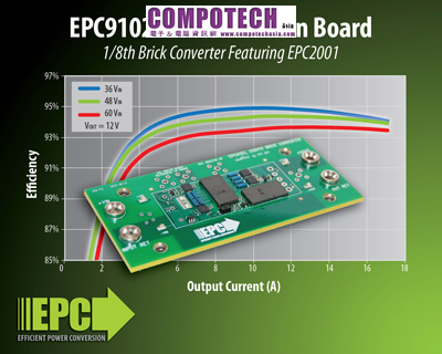 宜普電源轉換公司宣佈推出EPC9102演示板,這是一個全功能的八分之一磚轉換器演示板。這塊電路板就是一個36V-60V輸入、12V輸出、375kHz相移全橋(PSFB)式八分之一磚轉換器,最大輸出電流為17A。該演示板內含100V EPC2001 eGaN FET及德州儀器專為驅動eGaN FET而設的半橋柵極驅動器(LM5113)。