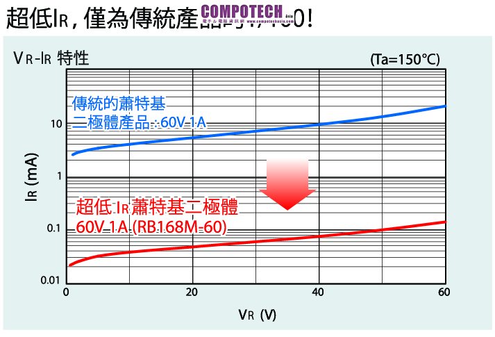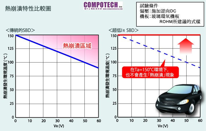 車用電子產品/電源裝置等的電路往往在高溫環境下使用,為了避免發生「熱崩潰」的現象,一般均使用整流二極體或快速回復二極體(FRD)。但由於整流二極體或快速回復二極體的VF值較高,因此往往難以達成電動車(EV)或油電混合車(HEV)所需的低耗電目標。 在此一背景下,市場上對於研發出既能在高溫環境下使用,同時並具備低VF值的蕭特基二極體產品的需求也日益殷切。 新產品說明 本次,ROHM藉由採用最適合高溫環境使用的金屬材料,實現業界最頂級的低IR目標。與傳統的蕭特基二極體產品相較之下,IR降低為原來的1/100,即使在高溫環境下也能使用。因此,可完全取代整流二極體及快速回復二極體,大幅改善VF特性(比傳統的快速回復二極體低40%)。此外,低VF還能抑制發熱,成功縮小封裝體積,對於電子化、小型化需求日益強烈的電動車及油電混合車提供最有力的協助。