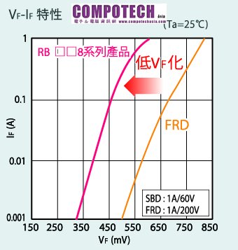 今後,ROHM將持續於降低VF及小型化,藉以完全取代整流二極體產品,為提升汽車電子產品及電源裝置的效率恪盡心力。ROHM預定將於7月11日(三) ~ 13日(五)於東京國際展示中心(Tokyo Big Sight)所舉辦的「TECHNO-FRONTIER 2012」中展示本產品,歡迎蒞臨ROHM的展場批評指教。 特長 ・相較於傳統產品,損耗降低約40% 相較於汽車電子產品一般所使用的快速回復二極體,VF降低約40%,有效達成低耗電的目標。 ・採用小型封裝,有效精簡空間 相較於傳統產品,讓您能以單一尺寸小型封裝來設計產品。 ・即使在高溫環境下也不會發生「熱崩潰」的現象 超低IR,即使在Ta=150°C環境下,也不會發生「熱崩潰」的現象,最適合在車用電子產品等高溫環境下使用。