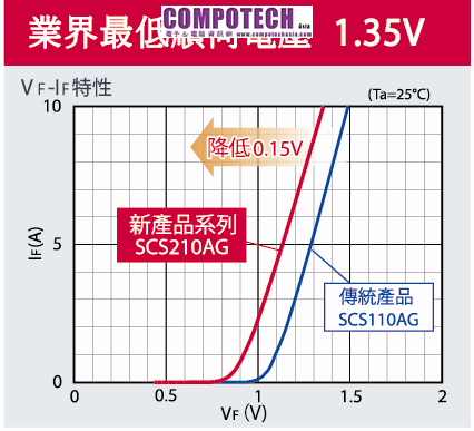 通常,當順向電壓降低後,往往會造成逆向漏電流增加,但ROHM藉由製程與元件結構的改善,不但能維持低漏電流,同時還能成功地降低順向電壓。尤其是順向上升電壓較低時,也就是一般最常見使用之低負載狀態下的效率改善,更是十分受到業界矚目。