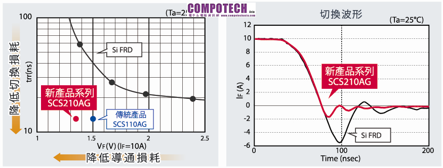 藉由高速切換效率與低VF等特性,與傳統的Si產品相較下,可大幅降低損耗除了達成碳化矽SiC所特有的高速切換效率外,同時還能進一步降低順向電壓。相較於傳統的矽質快速回復二極體,更能大幅降低損耗。