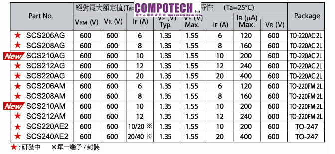 半導體製造商ROHM株式會社(總公司:日本京都市),全新推出順向電壓(VF=1.35V)達※業界最低之第二代SiC (碳化矽:Silicon Carbon)蕭特基二極體「SCS210AG/AM」(600V/10A),適用於太陽能發電系統的功率調節器、工業裝置、伺服器、空調裝置等之電源電路。