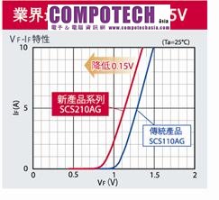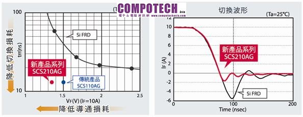 除了達成碳化矽SiC所特有的高速切換效率外,同時還能進一步降低順向電壓。相較於傳統的矽質快速回復二極體,更能大幅降低損耗。