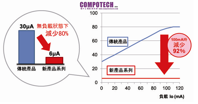 暗電流比傳統產品低80%,本次所推出的全新系列即使在負載電流增加的情況下,仍能維持6μA暗電流,在負載100mA時,更可降低92%之多。