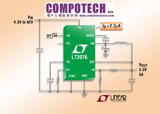 2012年7月19日 - 凌力爾特日前推出42V降壓切換穩壓器LT3975,可提供2.5A的連續輸出電流,並只耗2.7μA的靜態電流。而另一元件LT3976可從40V輸入操作,提供高達5A的輸出電流,並僅需3.3μA的靜態電流。兩款元件提供了4.2V至標稱40V的輸入電壓範圍,是汽車和工業應用的理想選擇,內部高75mOhm開關更提供高達90%的效率。