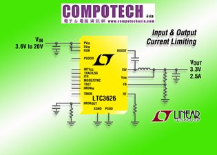 2012年7月20日 – 凌力爾特(Linear Technology Corporation )日前發表高效率、3MHz同步降壓穩壓器LTC3626,此元件可提供輸入和輸出電流限制和監控,並包含獨特的定頻 / 控制導通時間、電流模式架構,可透過3mm x4mm QFN封裝,以低如0.6V的輸出電壓提供高達2.5A的連續輸出電流。其電流模式操作提供了最佳的輸出及負載瞬變響應,即使是高降壓比情況。