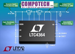 2012年7月24日- 凌力爾特(Linear Technology Corporation )日前推出具備理想二極體的突波抑制器LTC4364,為汽車、航空電子設備和工業控制系統中的4V至80V電子元件提供精小和低損耗的保護。該突波抑制器可保護下游電子元件免受輸入過壓和過電流影響,使其在發生瞬變突波時仍可連續運作。過電流限制可保護系統及電源免受短路影響。LTC4364的獨特之處,在於其理想二極體控制能於電源路徑以低損耗N通道MOSFET取代肖特基二極體。理想二極體及強固的前端可在反向輸入下降至-40V時保護負載,以及於輸入不足時維持輸出電壓。