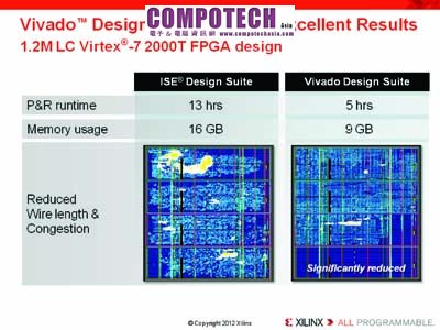 有鑒於現今設計的規模與複雜度,研發人員面臨許多設計挑戰,常常無法達到自動完成設計的目標。Vivado 設計套件 2012.2版本的佈局與繞線技術採用各種分析技巧加快建置週期,為佈線壅塞、總線路長度與時序等多重與同步設計的方法進行最佳化。對於複雜的設計案,Vivado 設計套件 2012.2版本將能提升15%的效能。相較於ISE設計套件,Vivado 設計套件2012.2版本在速度方面領先1個速度等級,同時和競爭元件相比,Vivado 設計套件 2012.2版本在中階產品系列可帶來超過3個速度等級的高效能優勢,同時在高階產品系列提供了更好的的效能功耗比,更能夠為各系列的低成本產品帶來更佳的效能。