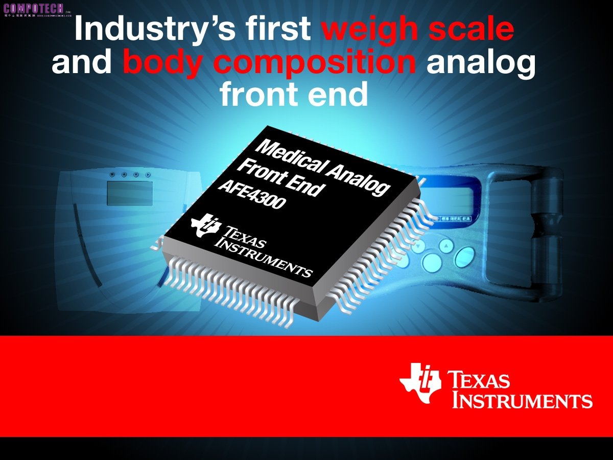 2012 年 8 月 7 日--德州儀器 (TI) 宣佈推出業界首款全面整合型類比前端,可進行體重及身體組成成分測量 (Body Composition Measurement; BCM) 。該 AFE4300 是一款簡單易用的高精度低功耗前端解決方案,可幫助工程師設計出整合身體組成成分測量儀、身體阻抗分析儀 (body impedance analyzer) 以及阻抗測量設備。與實施現有複雜的多晶片解決方案相比,可加速產品上市時程。