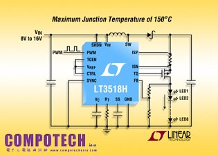 LT3518 可從標稱12V 輸入驅動達8顆350mA白光LED,為汽車顯示器背光等應用的理想選擇。同時該元件能於LED 的高壓端感測輸出電流,因此能進行降壓、升降壓或升壓配置。於升壓模式時,此元件可由精小