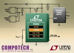 2012年8月28日 - 凌力爾特(Linear Technology Corporation)日前推出LT4275 LTPoE++™、PoE +和相容於PoE的受電裝置(PD)介面控制器,主要用於要求達90W電源之應用。PoE +限制了PD最大功率至25.5W,這對於提供新型的高功率需求應用,如微微蜂巢式基地台 (picocell)、基地台,指示標誌和戶外攝影機是不足的。凌力爾特的LTPoE++標準透過將功率規畫擴展為包含四種不同的功率位準(38.7W、52.7W、70W和90W)而建構了完整的高功率LTPoE+ +系統,滿足市場需求。LTPoE+ +標準採用的分類法能輕易使LTPoE++供電裝置(PSE)控制器和LTPoE+ PD控制器彼此進行可靠的通訊,同時保持與IEEE標準設備間的互操作性。LT4275A (LTPoE++)、 LT4275B (PoE+)和LT4275C (PoE) 可僅透過一個IC便能有效的供電至PD負載。