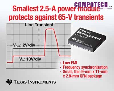 2012年10月9日--德州儀器 (TI) 宣佈推出一款支援65V暫態保護的全新電源模組,透過簡單易用的極小型封裝整合DC/DC轉換器、電感以及被動元件。該 2.5A TPS84250符合EN55022 B類電磁輻射(electromagnetic emissions)標準,並支援頻率同步特性,能夠俐落地為測量測試、工業馬達控制、醫療以及影像應用中的高靈敏雜訊類比電路供電。更多資訊與訂購樣品,請參見網頁:www.ti.com/tps84250-prtw。