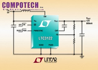 2012 年10月19日–凌力爾特( Linear Technology)日前發表內建輸出斷開的3MHz電流模式、同步升壓DC/ DC轉換器 LTC3122 。其內部2.5A開關可從開機時1.8V(運作時0.5V)至5.5V的輸入電壓範圍提供高達15V的輸出電壓,使其成為電池或標準3.3V和5V電源的理想選擇。 LTC3122可從5V輸入以12V提供高達800mA的連續輸出電流。接腳可選的Burst Mode®操作可將靜態電流降至僅25μA,因此可在手持式應用中提供更長的電池續航力。結合散熱加強型3mm x 4mm DFN-12(或MSOP-12)封裝和高達3MHz的恆定切換頻率特性,使設計人員能以所需效率平衡PCB解決方案的尺寸。
