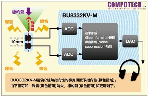 半導體製造商ROHM株式會社(總公司:日本京都市)全新研發出數位訊號處理器IC「BU8332KV-M」,適合智慧型手機及汽車導航裝置上的麥克風使用,為2組無指向性的麥克風賦予敏銳的指向性(波束形成(Beamforming)技術),以提升音訊品質。
