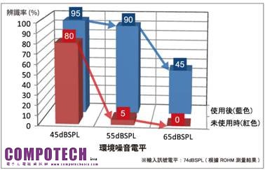 使用本產品不需要犧牲音訊品質,即可降低環境噪音。因此能提高環境噪音所在區域的音訊辨識率,根據本公司測量結果,只要在噪音電平為55dBSPL的環境下使用本產品,便能將音訊辨識精確度由5%提升至90%。