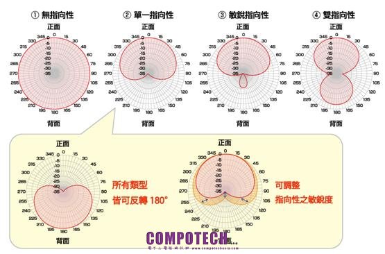 本產品提供4種不同形狀的指向性類型,可供切換。可將指向性的方向反轉180°,或是調整指向性之敏銳度。所有控制方式,皆不需要改變麥克風配置,僅需作暫存器設定即可。