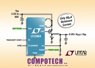 2012年11月9日 – 凌力爾特(Linear Technology Corporation )日前發表高壓降壓DC/DC 控制器LTC3864,其可透過Burst Mode®操作模式致能輸出,待機模式下只耗40uA。 3.5V 至60V的輸入電源電壓範圍旨在提供對於高壓瞬變之保護,以在汽車冷啟動時連續工作,並涵蓋廣泛的輸入源和電池化學。由於擁有100%工作週期能力,輸出電壓可設定於0.8V至VIN間,因此非常適於12V或24V汽車、重型設備、工業控制,機器人和電信應用。