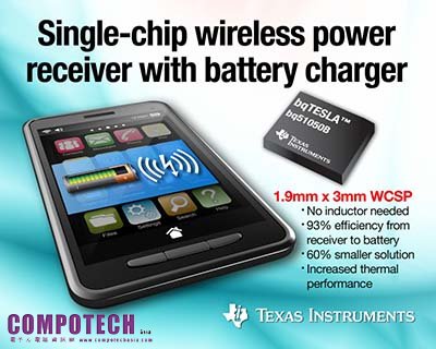 2012 年 11 月 16 日--德州儀器 (TI) 宣佈推出首款單晶片無線電源接收器,整合電池充電器與全新「自由位置」 (free position) 發送器積體電路,將充電面積擴大 400%,使無線電源得以實現。該兩款 bqTESLA™ 電路不僅為智慧型手機使用者提供更簡單方便的充電體驗,還可幫助設計人員在更多裝置上實作無線電源技術,包括汽車監控平台 (automotive console)、充電板與辦公傢俱 (office furniture) 等。詳細產品資訊及訂購樣品與 bqTESLA 開發套件,請參見網頁:www.ti.com/wirelesspower-pr。